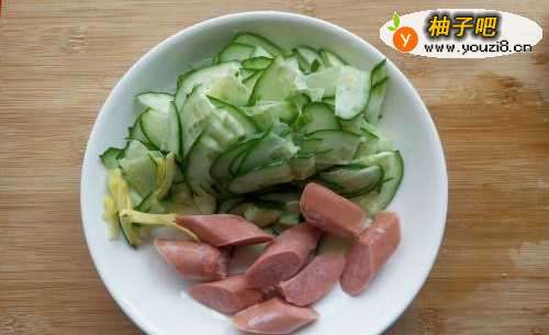 2黄瓜切片、肠切块。