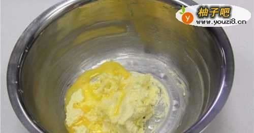 室温软化的黄油加入细砂糖打发至颜色变浅,体积膨胀,分三次加入鸡蛋液继续打发至黄油呈轻盈羽毛状。