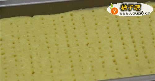 3面团取出放入保鲜袋擀开擀均匀,铺入磨具内(大小跟模具相同,不要擀得太厚),然后用叉子扎孔,防止烤的时候鼓起(如图)。
