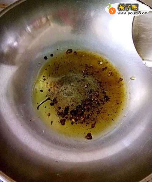 3锅里倒入油,冷锅下花椒粒小火炸香,之后捞出花椒不要,(我这里油放少了,多放些才香)
