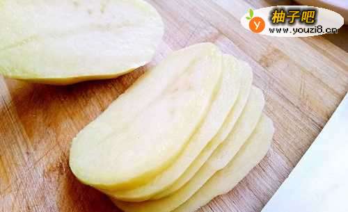 2先将土豆切薄片,再切均匀的细丝。不要切得太厚太粗,不易熟。