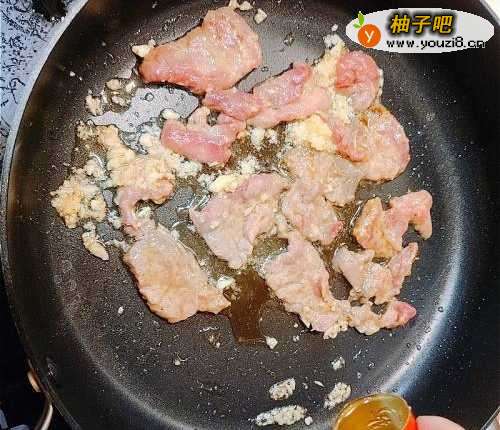 2先下少许油将牛肉快炒至少许变色。加入蒜蓉再炒匀。中途沿锅边下适量的绍酒再翻炒。