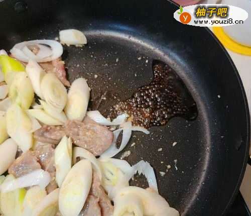 3加入大葱翻炒。并将生抽放在锅旁,等一下让它焦香,再混合材料兜炒。