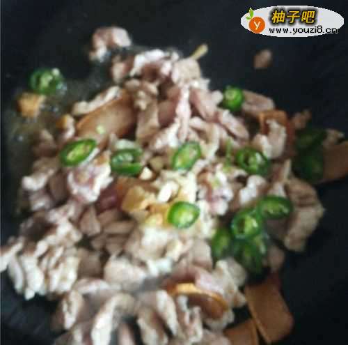 再倒入瘦肉,火力稍调大些,但不要用武火,翻炒瘦肉变色后,加入青尖椒去腥味。