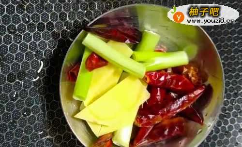 3锅留底油,倒入适量葱段、姜丝和干辣椒,炒香。