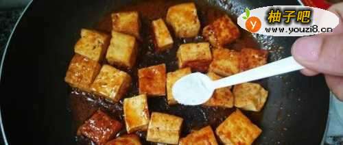 3锅中倒适量油,把豆腐块放下去煎至两面焦黄,然后淋入三块刚才调好的沙茶汁。