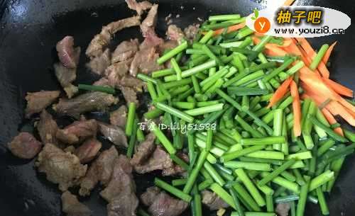 6将胡萝卜和韭菜花一起放入锅里,用大火快速翻炒。