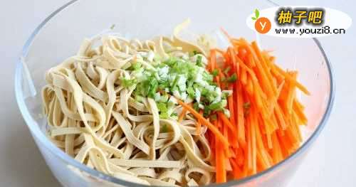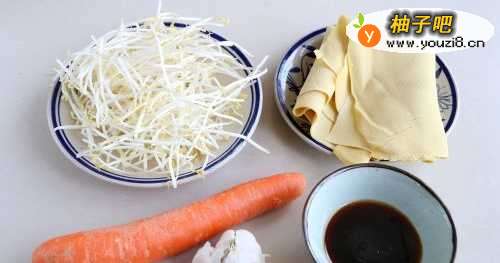 3豆腐皮洗净切成丝,胡萝卜去皮切成丝,大蒜、小葱切碎;