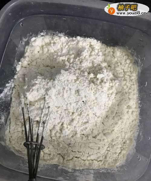 2然后往里面放入面粉,继续搅拌均匀,一直搅拌到无颗粒状态。如果中途不够水或者面粉,可以加一点,但是不能太多,不然就会越来越多。一般来说做多几次,比例多少都可以掌握住。