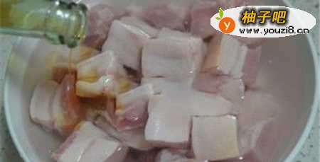 2肉洗净,切成2.5厘米见方的块,用清水加料酒浸泡15分钟。