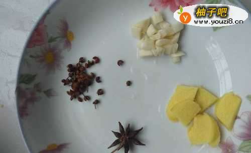 6热锅,倒入油,然后放入花椒,八角,蒜头,姜,爆香。