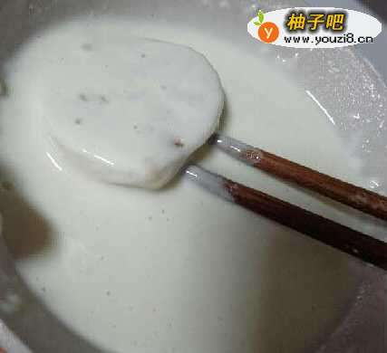9一个一个来,将所有的藕夹片放入面糊中裹外衣。