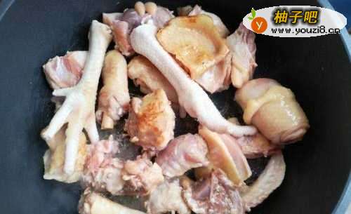 原料:鸡、土豆、青椒、栗蘑、姜和蒜