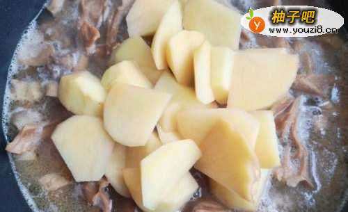 11用筷子扎一下鸡肉,可以轻松插入,下入土豆块,焖煮8分钟