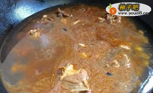 4翻炒3分钟左右即可一次性加满冷水,水量以莫过食材为准,盖上锅盖开大火烧开10分钟后即可转小火炖30分钟,直至黄豆软烂!