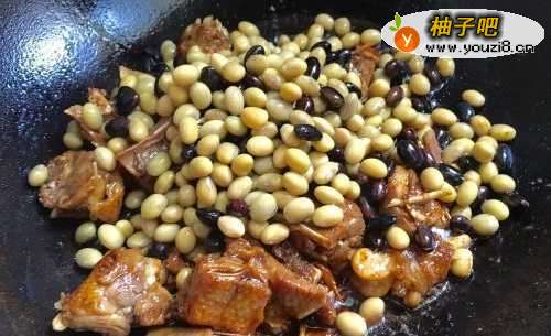 3紧接着将泡好的黄豆黑豆倒进去继续开大火翻炒大约3分钟即可。