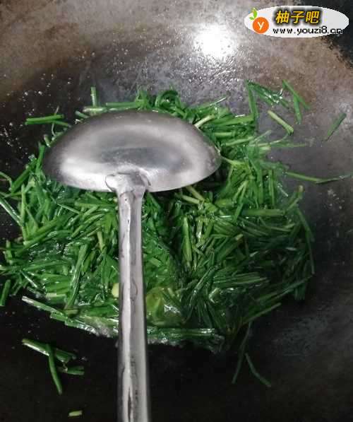 4锅中倒油,放入切好的韭菜,加入适量盐进行翻炒