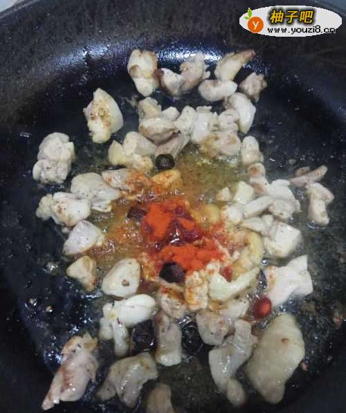 6翻炒变色后放入一勺辣椒面,继续翻炒。