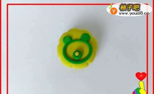 6再取绿色和黄色彩泥适量,制作出“小熊”的鼻子。