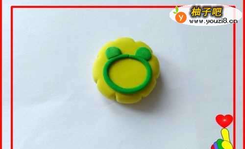 4取绿色彩泥适量,滚搓成细长条,弯曲成椭圆形,粘合在表面。