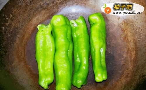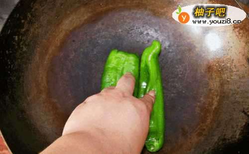 3用手按压青椒,使其紧贴锅壁,持续烧炕至呈现虎皮,拿出待用。