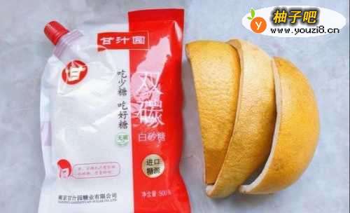 准备好新鲜的柚子皮和白砂糖。将柚子皮放在温盐水中搓洗一下,把表皮的杂质洗净。