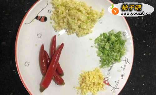 准备好葱姜蒜末和泡椒,泡椒需要剁碎,我只放了4个,喜欢辣一些可以多放几个泡椒。