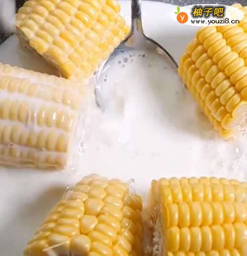 2放入锅中,倒入牛奶,将玉米翻滚一下