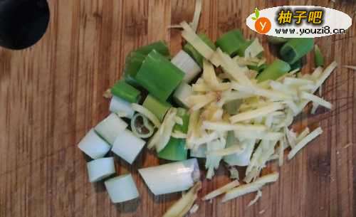 4第四步,干辣椒入味以后倒入生姜和大葱,把油炒香。