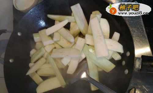 5第五步,在油锅中倒入切好的茄子翻炒。
