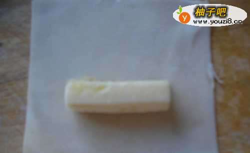 2香蕉切长条,取一张馄饨皮,将香蕉放在上面,包裹好之后,在粘合的那一处,摸点水,做成糖果状;