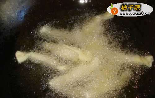 3起锅热油,锅内倒入多一些食用油,当油温3成热时,放入香蕉糖果,小火慢炸;