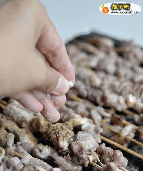 7把羊肉串翻动并撒上孜然粉和精盐。