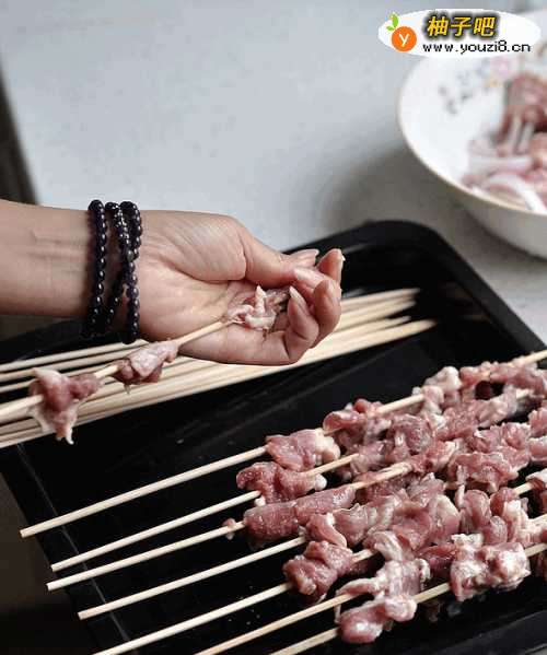 3把腌渍好的羊肉块顺着长度用竹签穿起,成羊肉串。