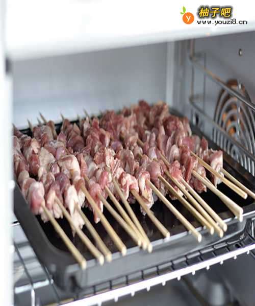 5把羊肉串架在烤盘上,放入烤箱。