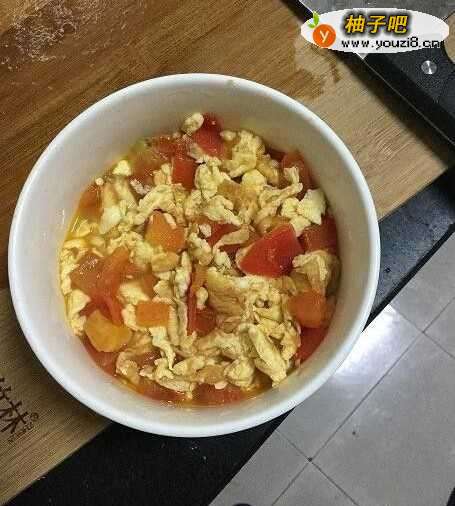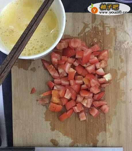先吧两个鸡蛋打到碗里,加盐,打碎,西红柿也切块备用。