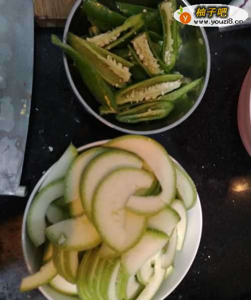 第一步,先把窝瓜和青椒洗干净切好以后装盘,窝瓜建议切片。