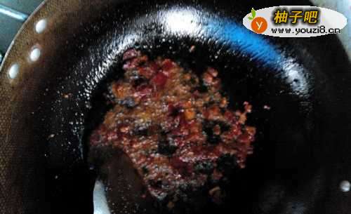 2在锅里把油烧会儿,冒点小烟是正常的,然后放入豆瓣酱(油烧会儿可以把豆瓣酱的味道发挥的淋漓尽致~)。