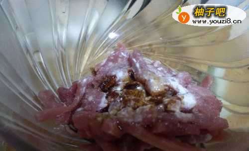 2猪肉切成小细丝,然后放到碗中,加料酒1勺、食盐半勺、酱油半勺、食醋1勺、淀粉、食用油抓匀腌制半小时!
