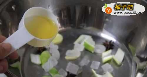 4将大葱切段,姜切片先在锅底铺上葱段、姜片和八角,再放入50克的冰糖,淋入花生油,倒入酱油均匀一些。