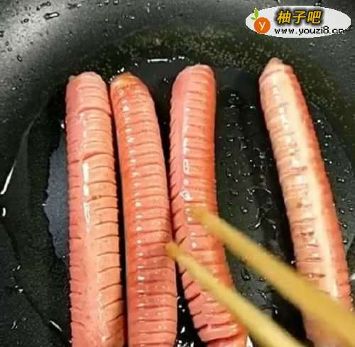 3开火,热油,油热了就把烤肠下锅,要不停的翻面,煎至改刀的刀口裂开。