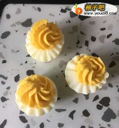 7将挖出的蛋黄放入碗中,加入切碎的芝士,并加入芝士酱。