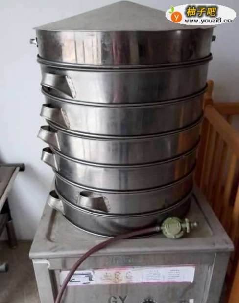 5肠粉蒸好后,将其卷成小圆柱形,一条挨一条放进蒸馒头的机器,放满一大层再放令一大层。由于肠粉蒸出来在其热量为散发之前已放进笼子里,且一条挨一条,热量能够得到保存,短时间内不会冷,冷了也可以插电加热。