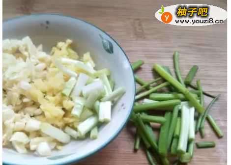 55、姜,蒜切末,小葱切段,葱叶葱白分开。