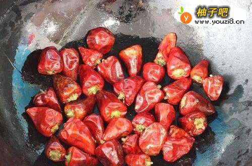 6锅里放少许油,把辣椒放锅里小火慢慢的炒,直到把辣椒炒干炒脆后捞出。(用同样的方法把花椒也炒干)