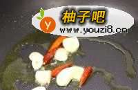 4取一平底锅,锅烧热后倒入适量油,油烧热后,把蒜肉和辣椒放入炒出蒜香味。