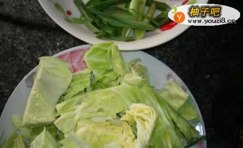 2将蒜苗洗净切段;将牛心菜洗净切小片;