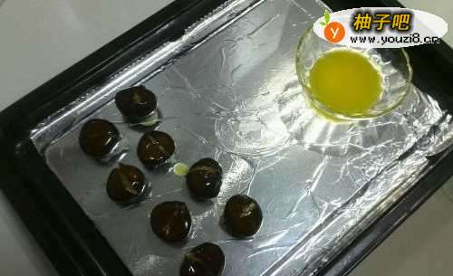 2烤盘铺锡纸,晾干栗子刷满黄油