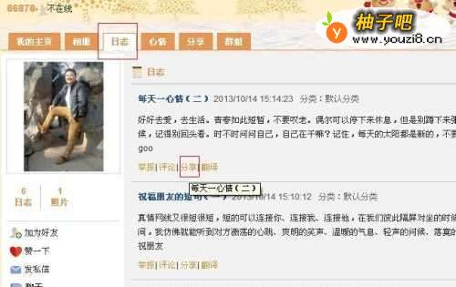 5第三步分享好友的日志,进入好友的个人主页点击“ 日志 ”,你会看到两个分享:站内分享和站外分享。首先说一下站内分享,就是把自己喜欢的好的文章分享到首页和自己的个人主页,在分享的时候注意书写评论与标签