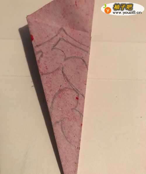 5第五步 都折完之后 再把最宽处向下折一道折痕 然后拿起绘图铅笔 在折痕下面开始画上几个简单的半个心形